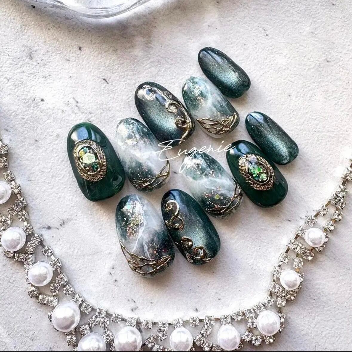 深みのあるグリーンに天然石ネイル風のニュアンスアートを合わせた大人上品なデザイン.*・゚