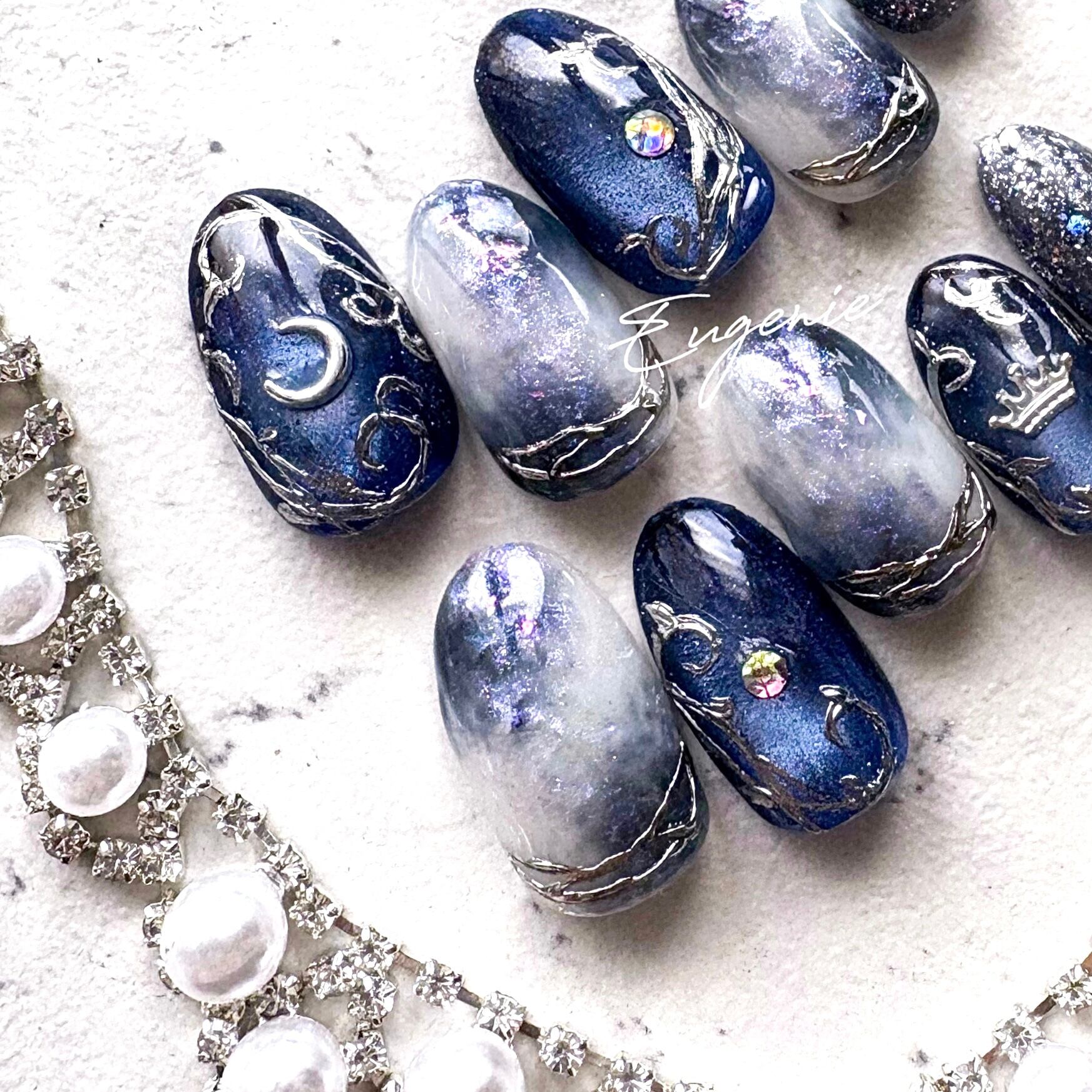 ひんやりとした世界観の中に、きらめきとファンタジーを詰め込んだ上品さと個性を掛け合わせたネイルです❁⃘*.゚