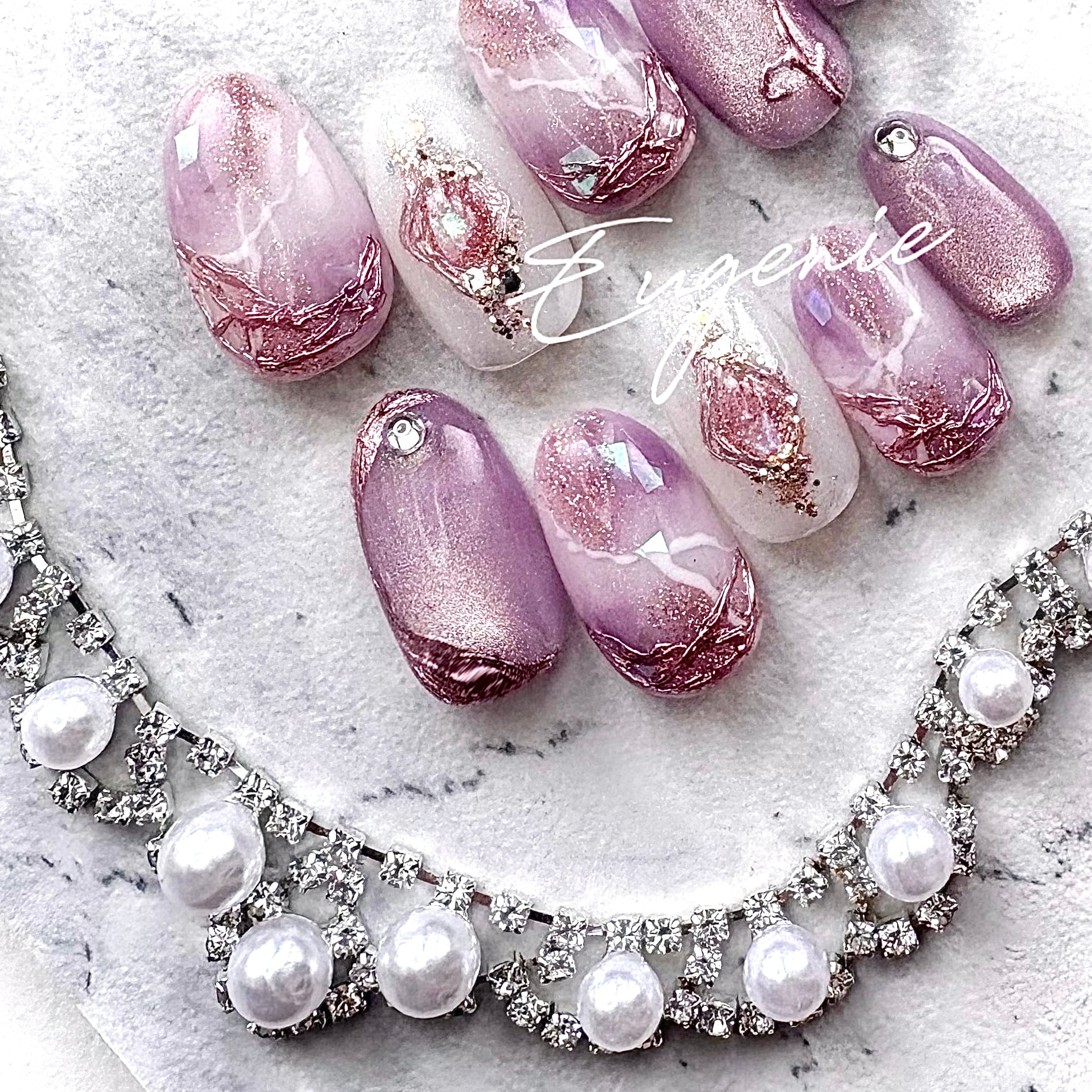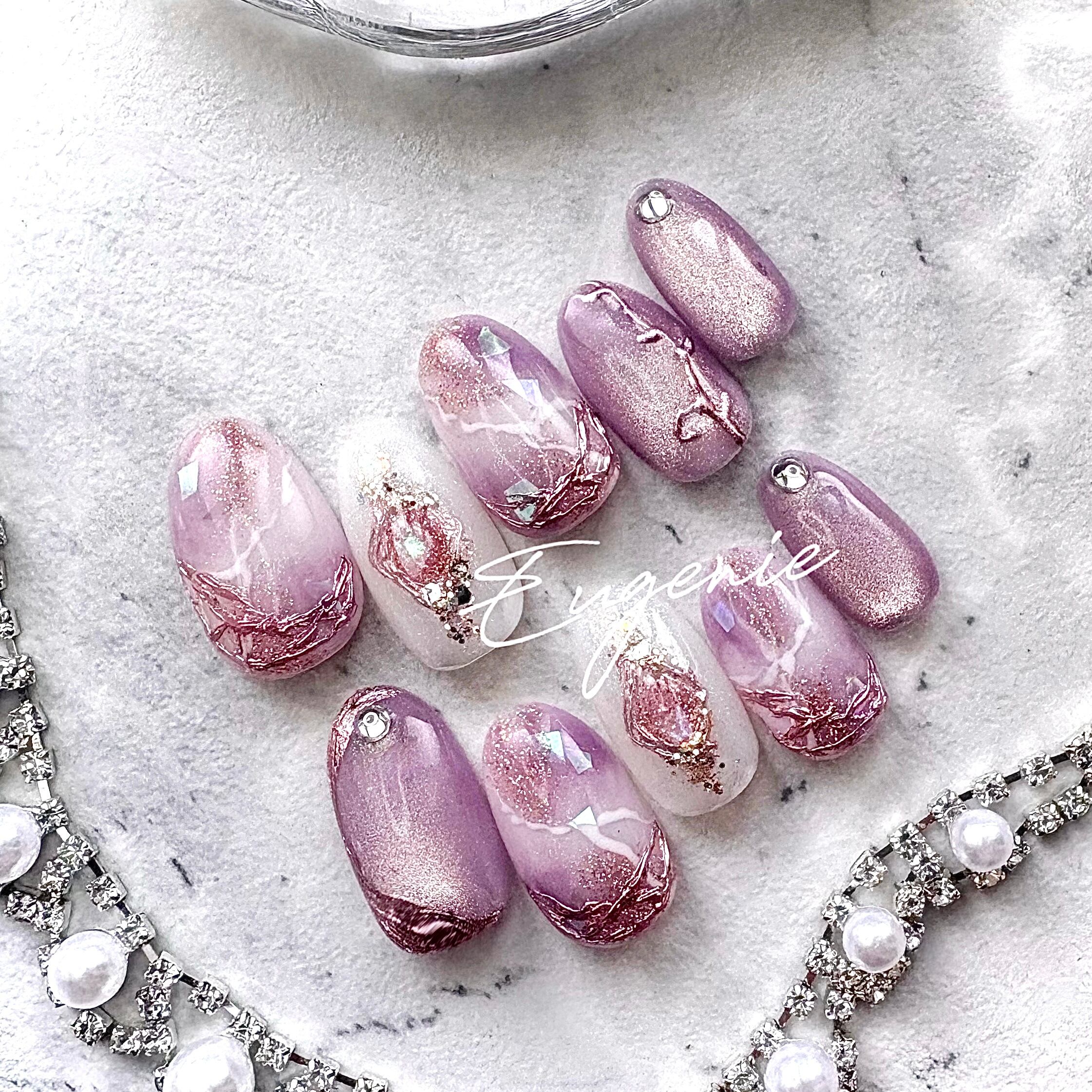 淡く溶け込むピンクとラベンダーを重ねた天然石ネイル⟡.·