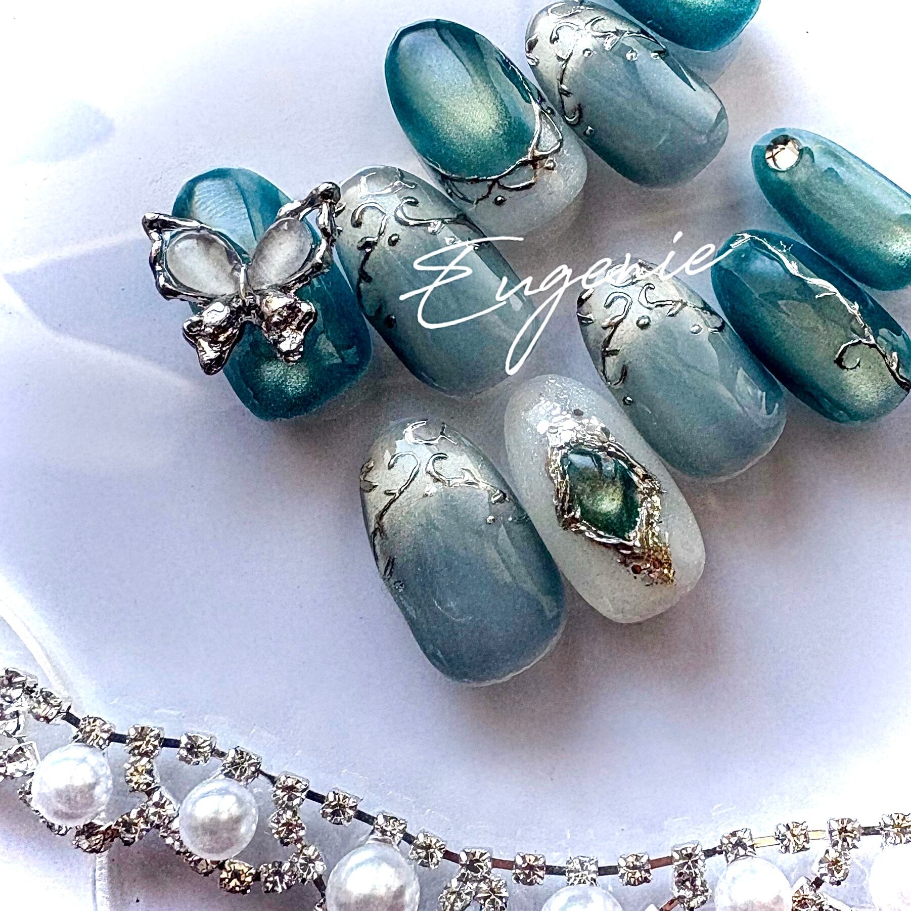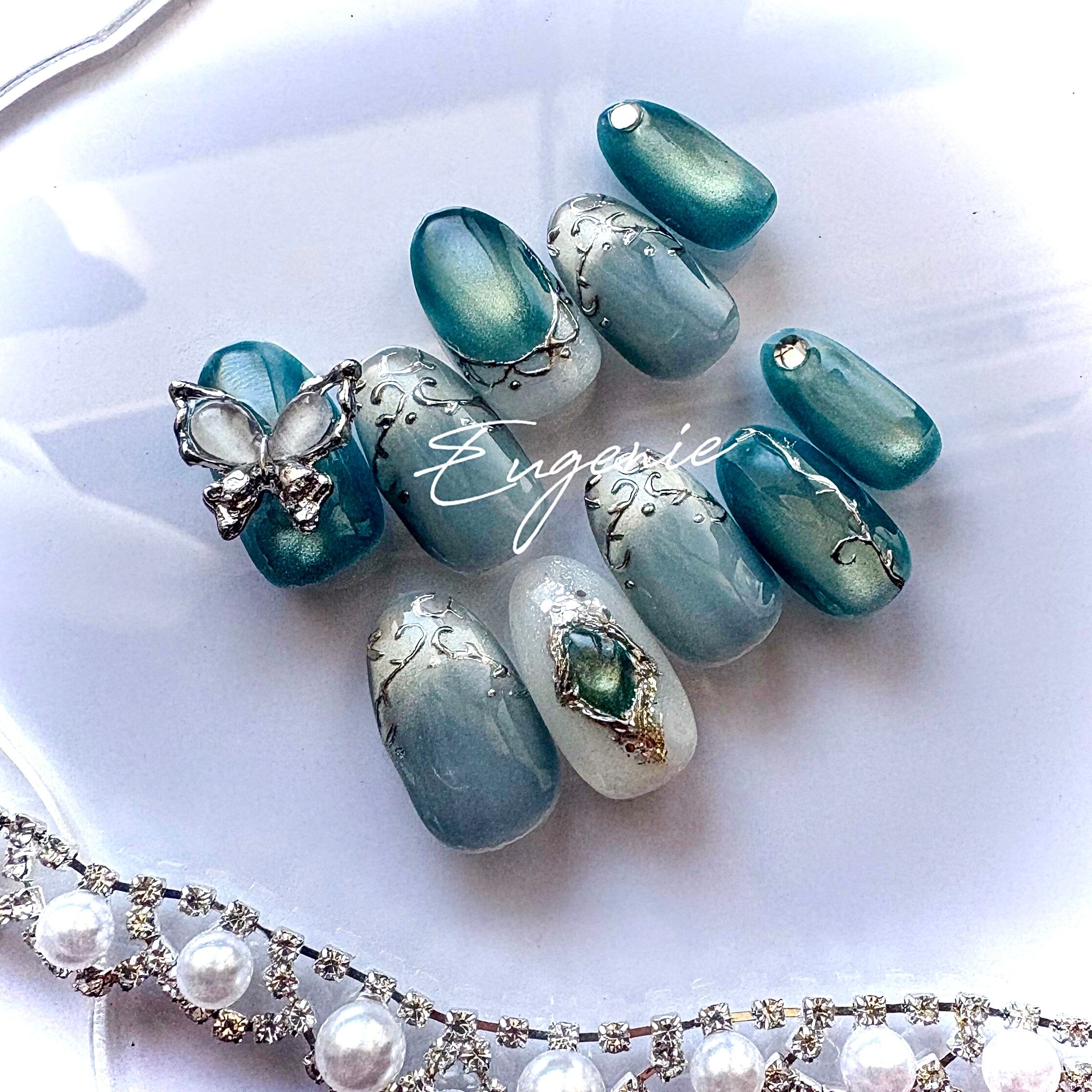 澄んだブルーグリーンが印象的な春夏にぴったりの幻想的なネイル.⋆⟡